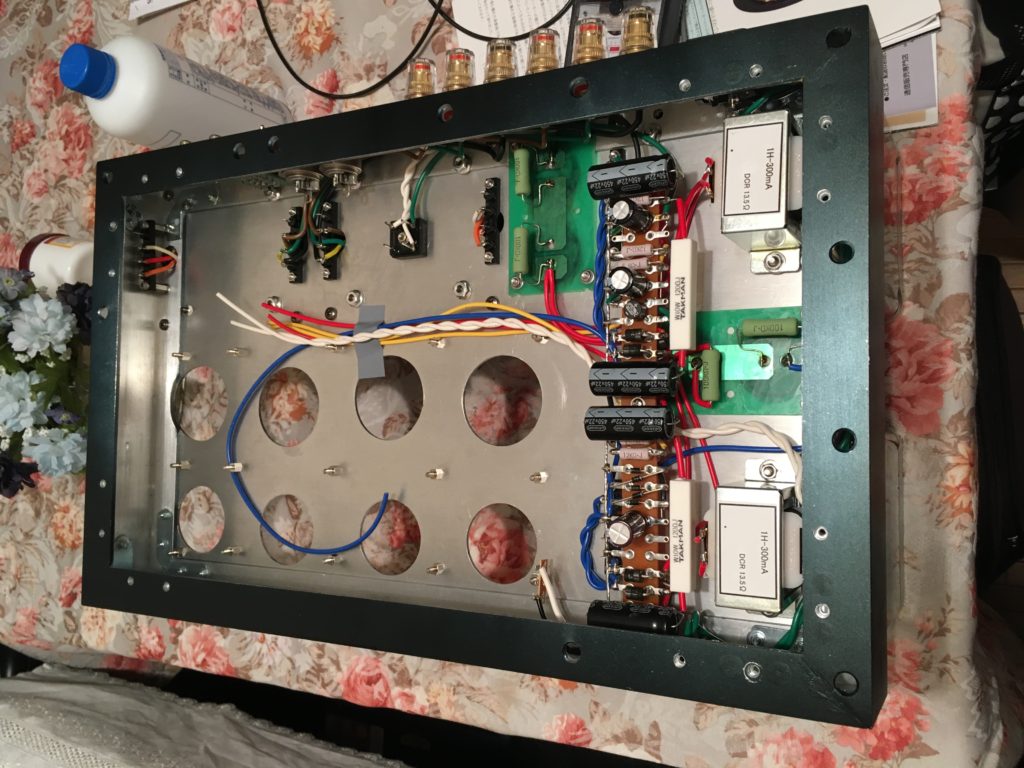 そこに電源トランス、出力トランス、電解ブロックコンデンサ、平滑回路、他入出力端子を取り付けました。